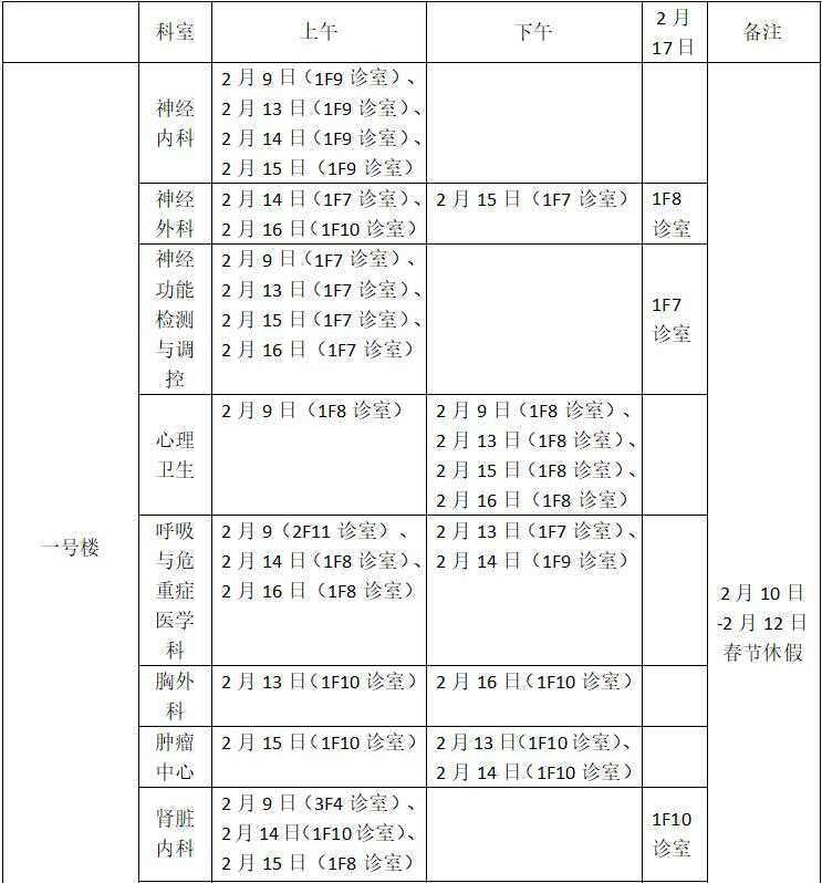 温馨提醒:1、公共号为无固定医生坐诊;2.康复理月疗科在3号楼2楼就诊;3.呼吸内科(11号-17号)、胸心外科从09:00开始;4.肾内科病房或血透室就诊;5.骨科下午在病房就诊;6.泌尿外科、骨科、疼痛科、耳鼻喉—头颈外科、肛肠科、肿瘤内科、神经外科2月10日(初一)到2月12日(初三)在病房就诊。