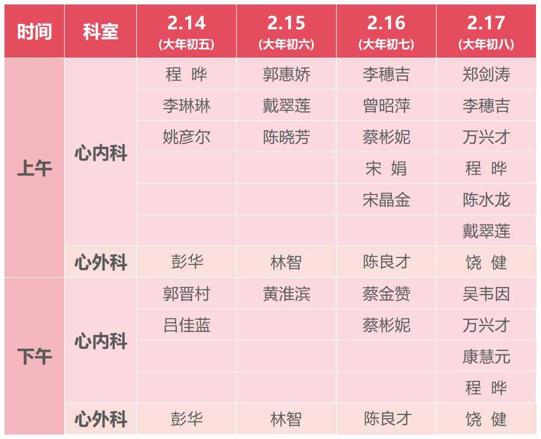 初一到初三门诊停诊,初四到初八门诊安排如下: