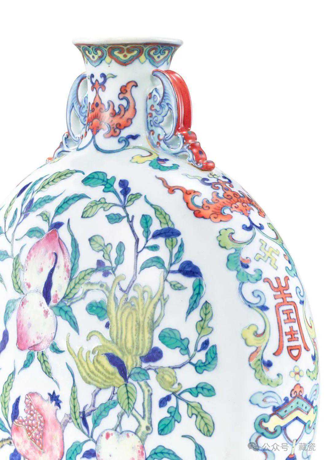 Lot3703清乾隆斗彩加粉彩福寿三多双蝠耳扁壶