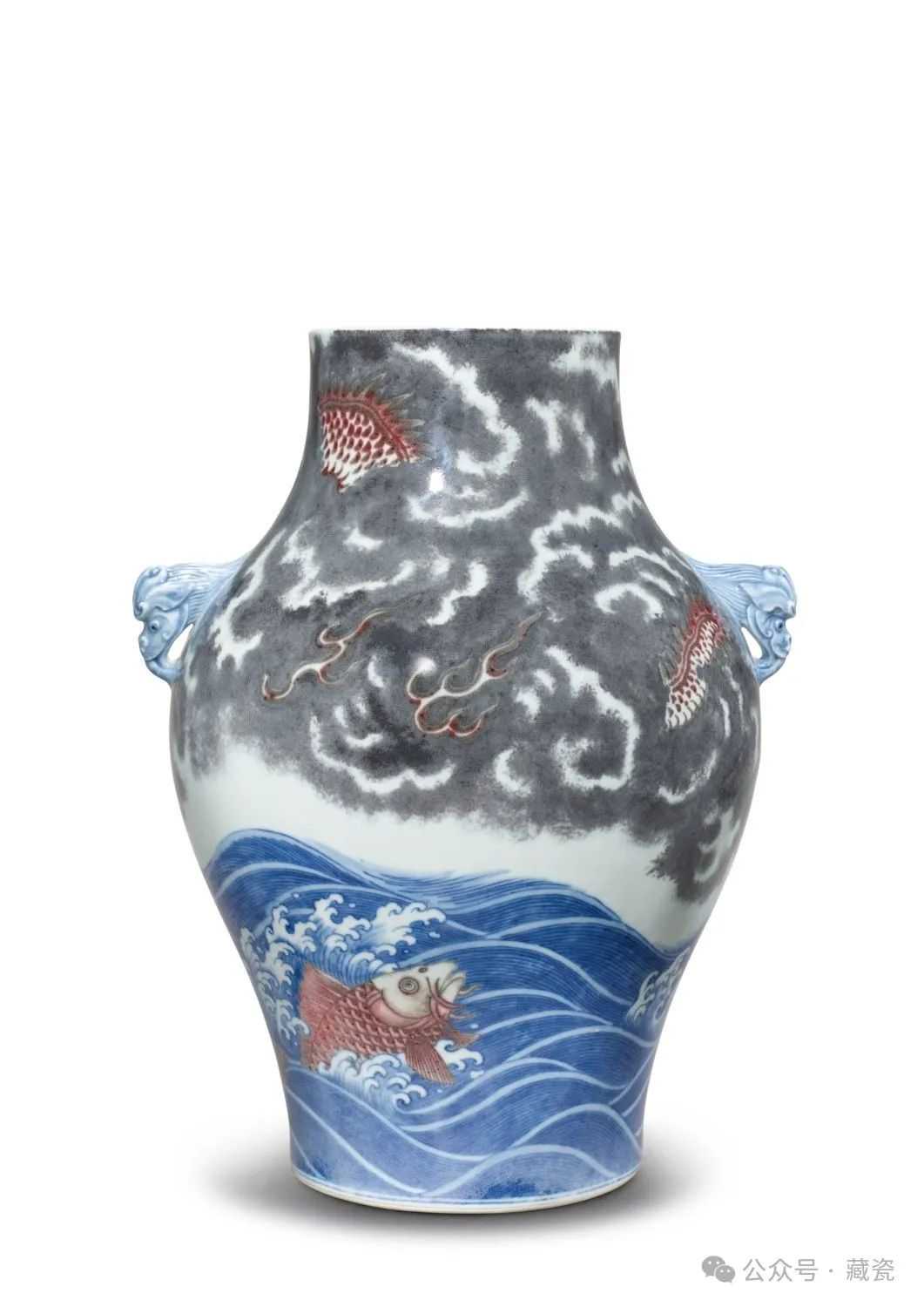 Lot3635清雍正至乾隆青花釉里红釉下黑彩鲤跃龙门兽耳壶