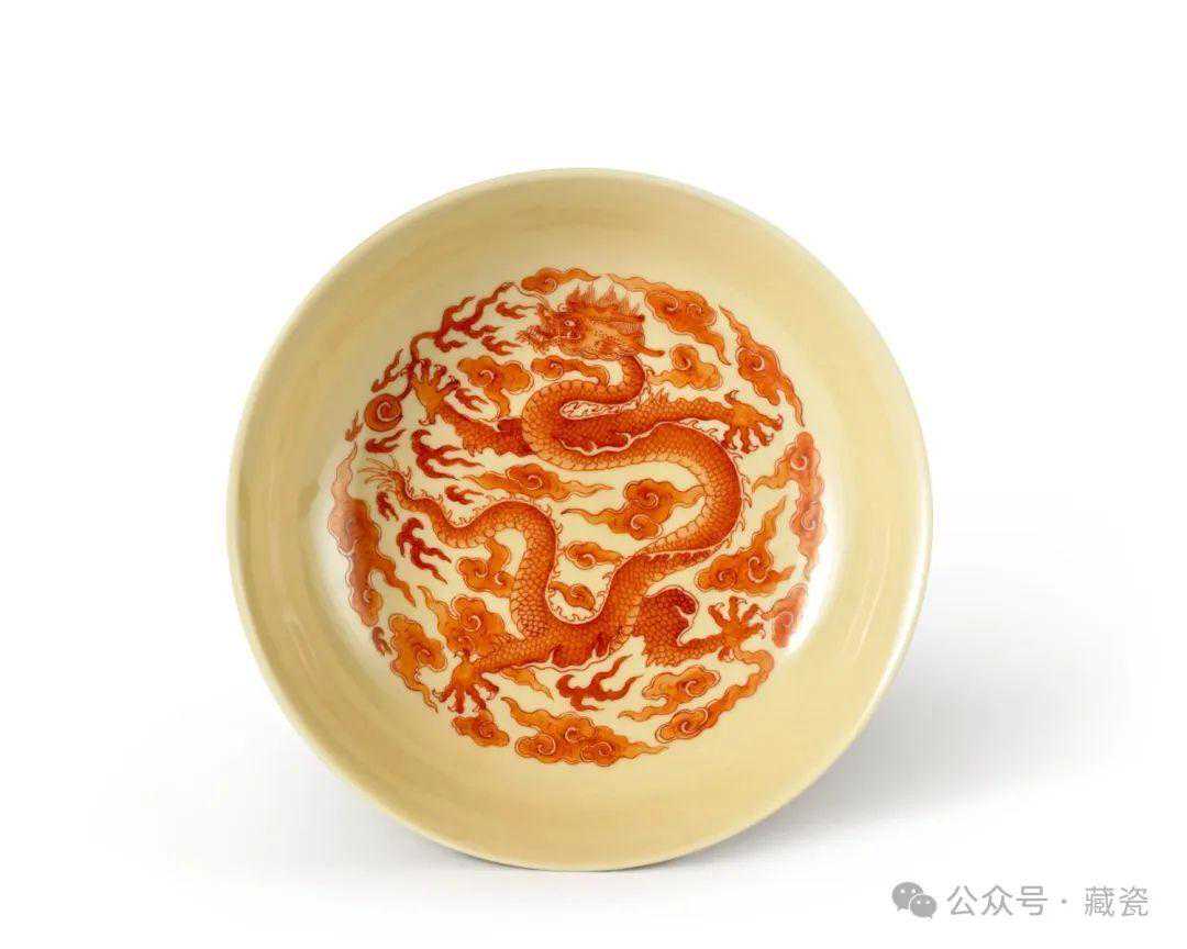 Lot3628清雍正米黄地矾红彩云龙纹盘