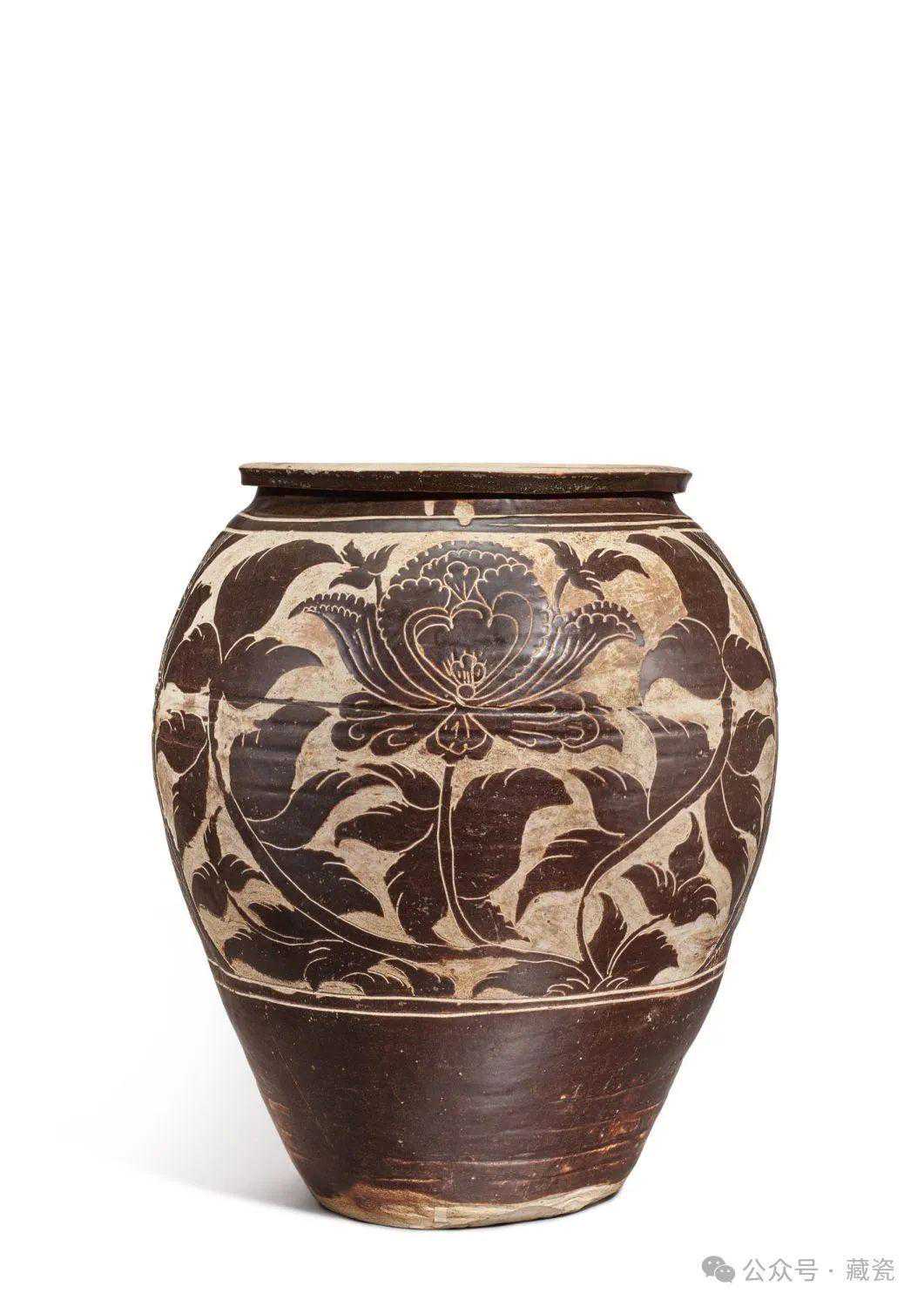 Lot3678西夏灵武窑黑釉剔牡丹纹罐