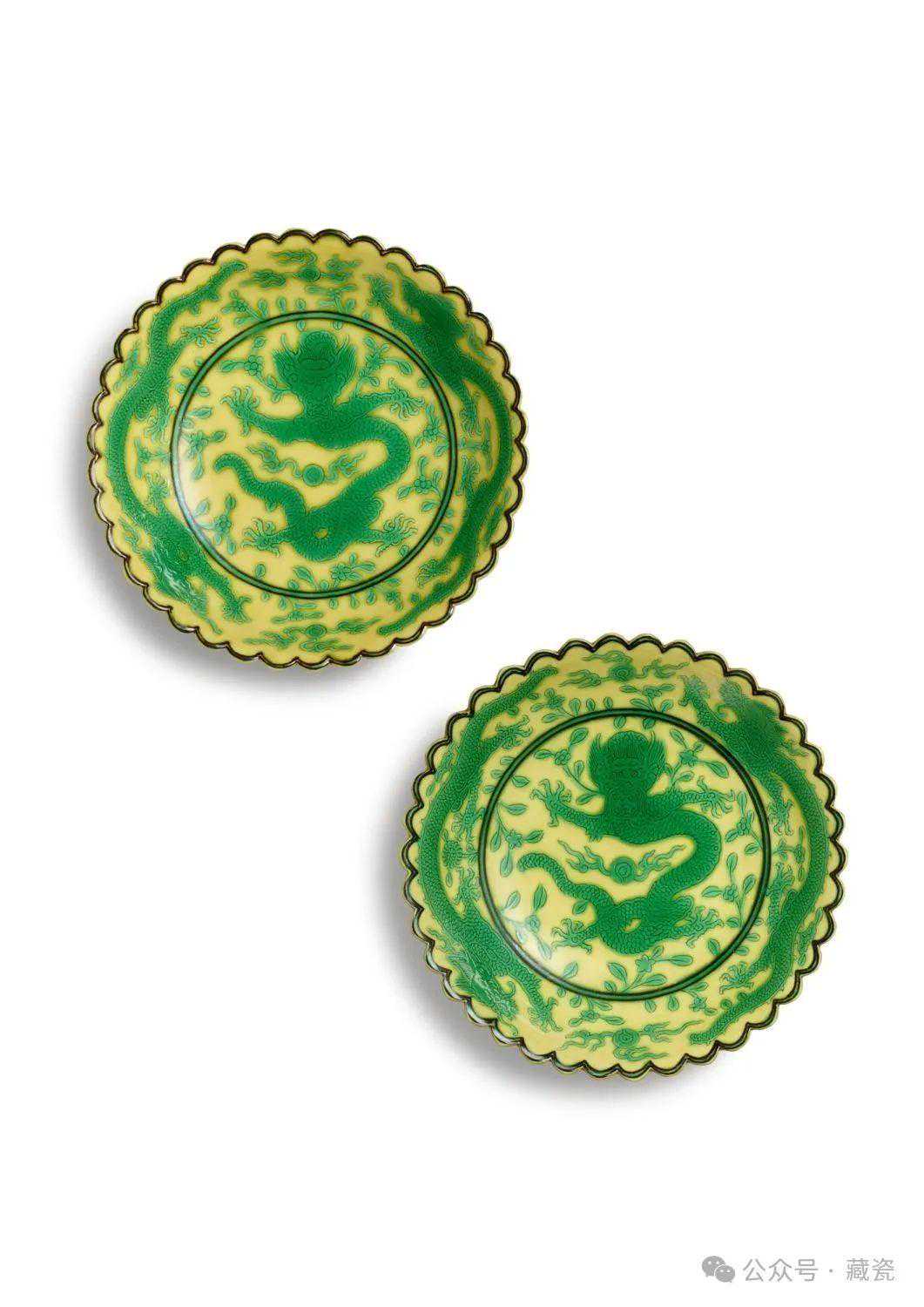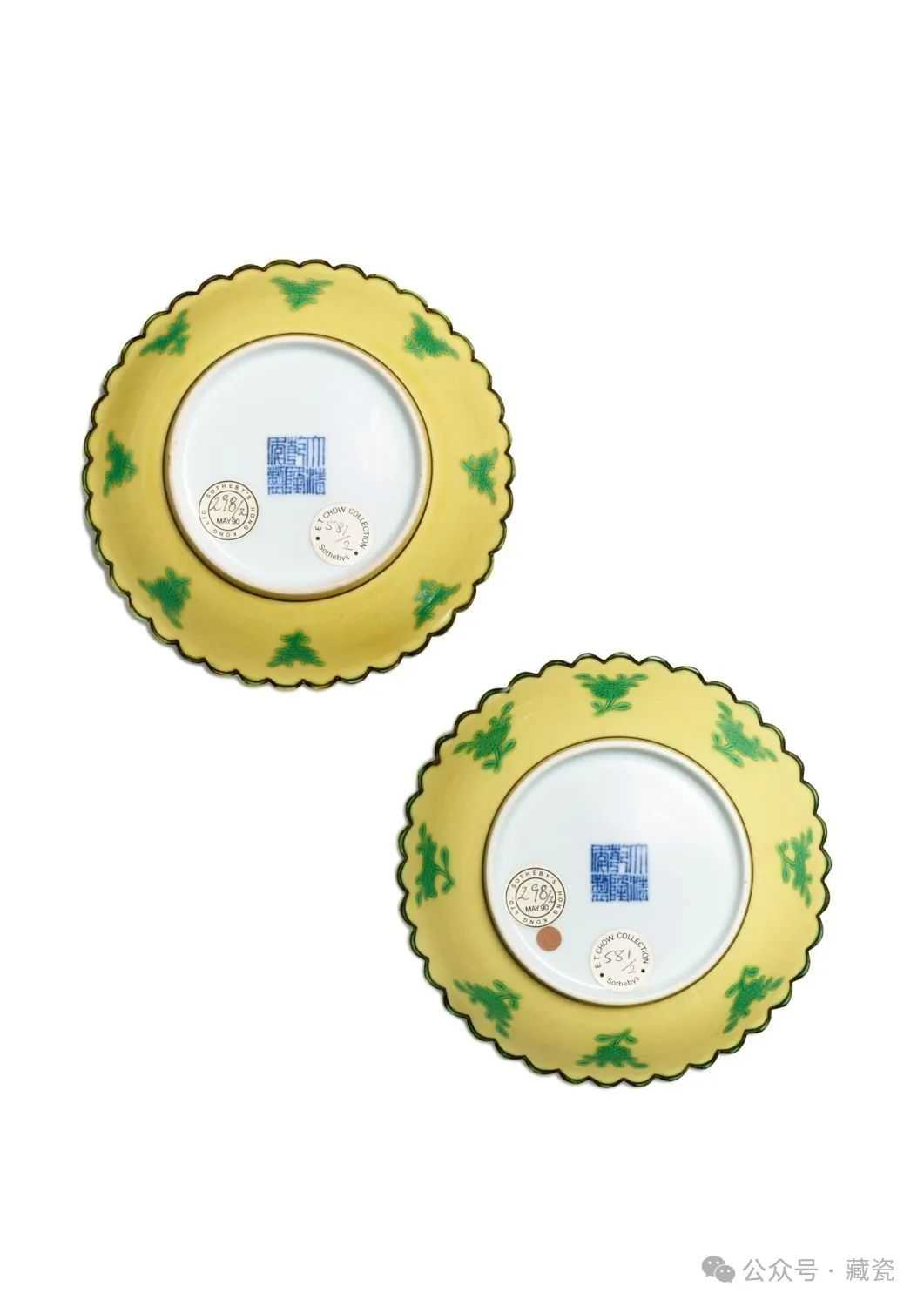 Lot3653清乾隆黄地绿彩龙纹花口盘一对