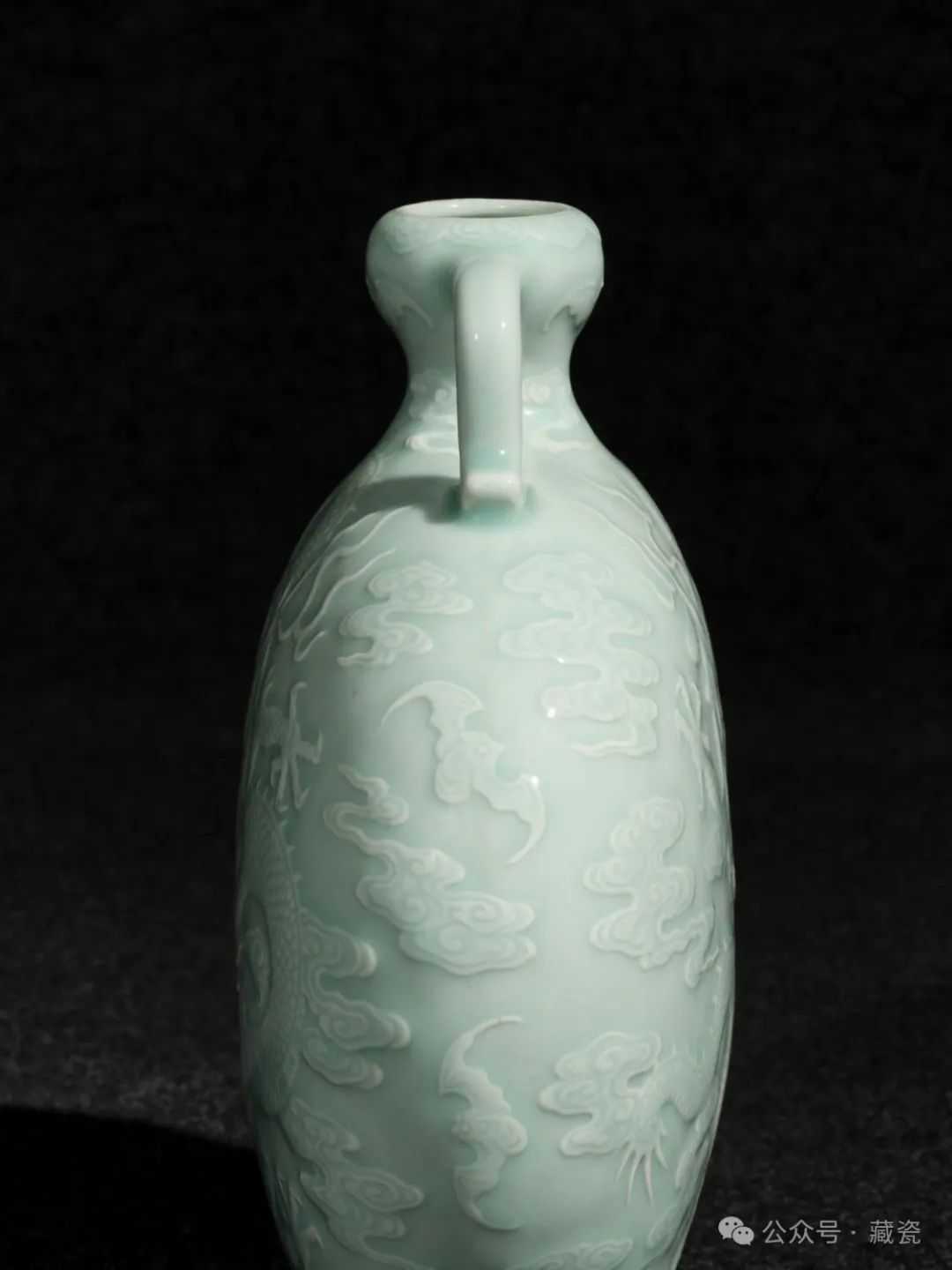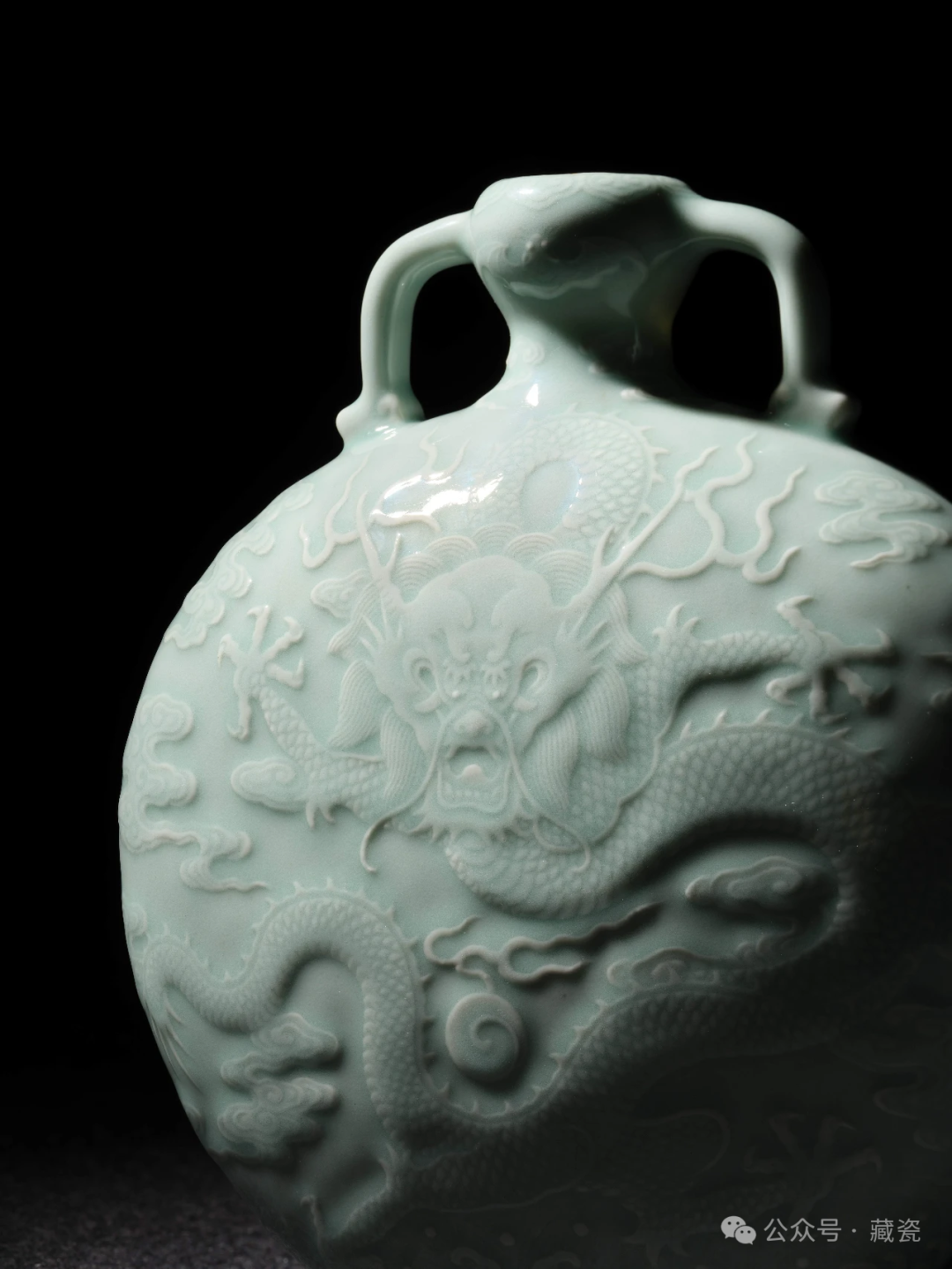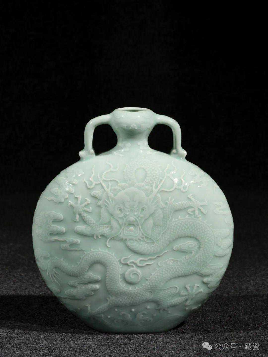Lot3634清乾隆粉青釉浮雕海水龙纹双耳扁壶