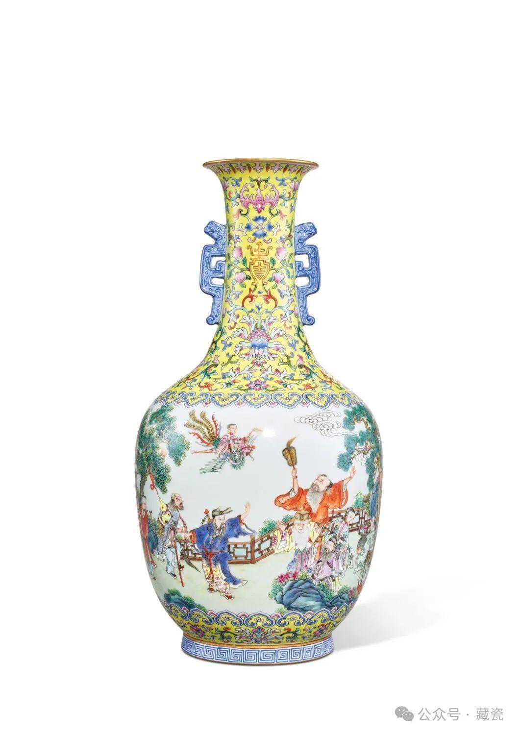 Lot3666清嘉庆黄地粉彩通景群仙祝寿图双耳瓶