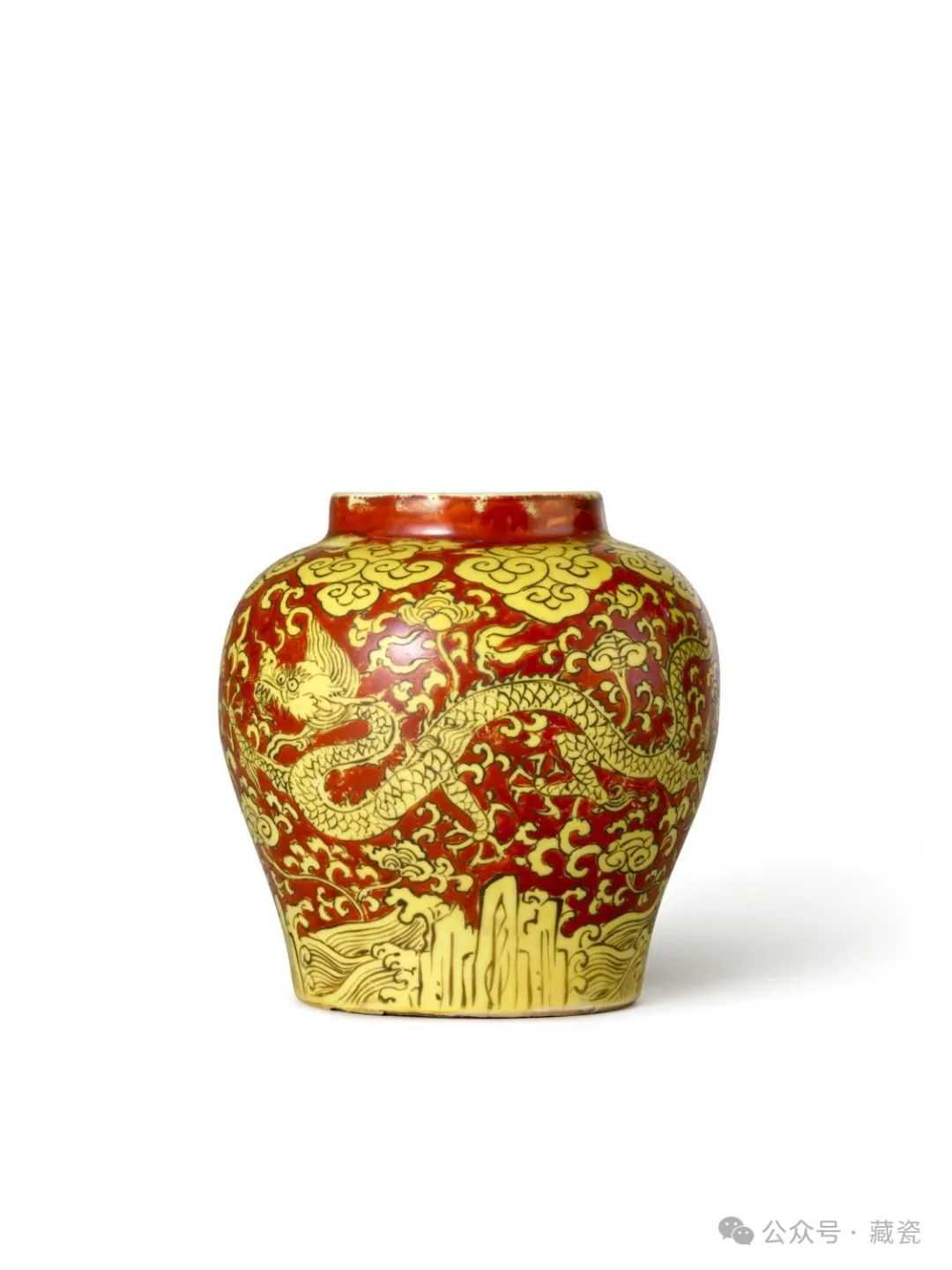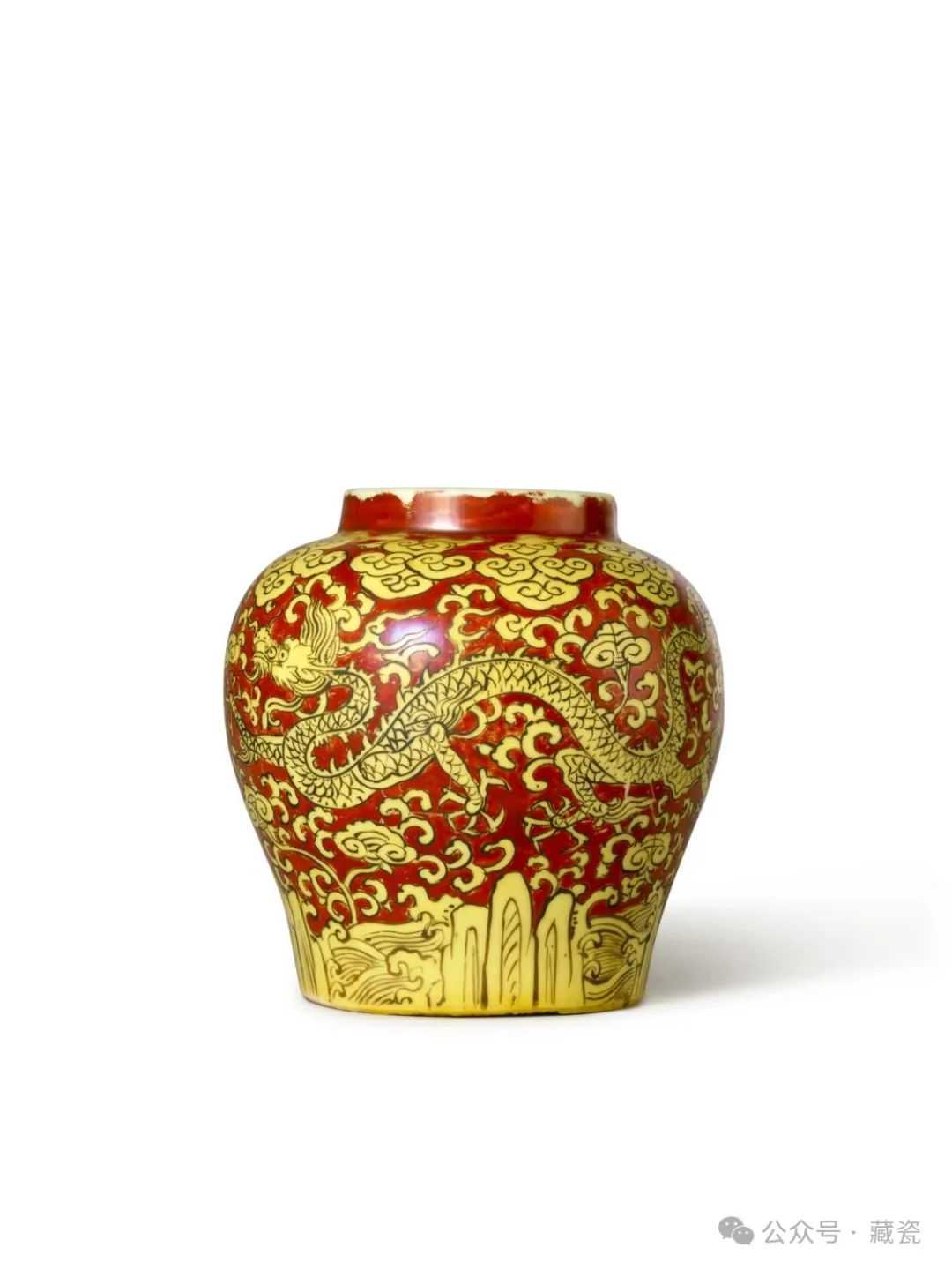 Lot3624明嘉靖黄地红彩云龙纹罐