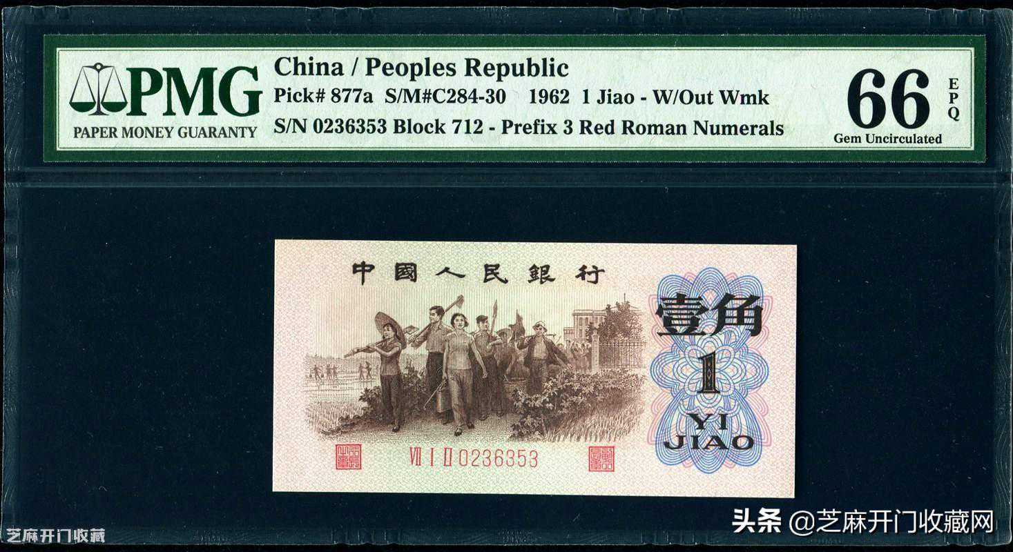 3:1962年中国人民银行第三版人民币1角,背绿无水印版,编号VIIII7274166,PMG66EPQ,成交价格:HKD12000