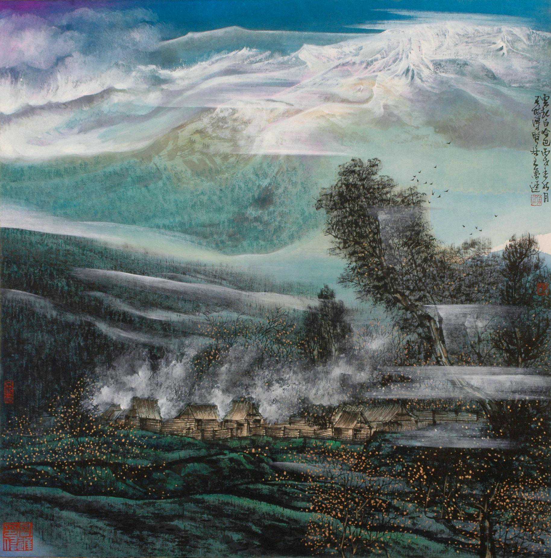 鲁迟笔下的山水具有独特的视觉图式。他坚守融合古今,折衷中外,借古开今,继承创新,笔墨大胆随意,奔放泼辣,自然巧妙地采用西方绚丽浓艳色彩。他笔下的大山、大水,蓝天、白雪,绿茵、黄土,红光、紫气,丰富和谐,融为一体,使人们深切地感悟到澎湃的艺术气势,不由自主地进入既雄浑迷茫又清新雅致的艺术意境,吸引人们在朴茂之美中,领略独特的隽永含蓄的东方情调。他大胆采用好似落茄、好似雨点、好似牛毛的独特皴法,自然形象地凸显出大山、大水、巨石的纹理、肌理和秩理,透射出雄浑秀丽的磅礴气韵。