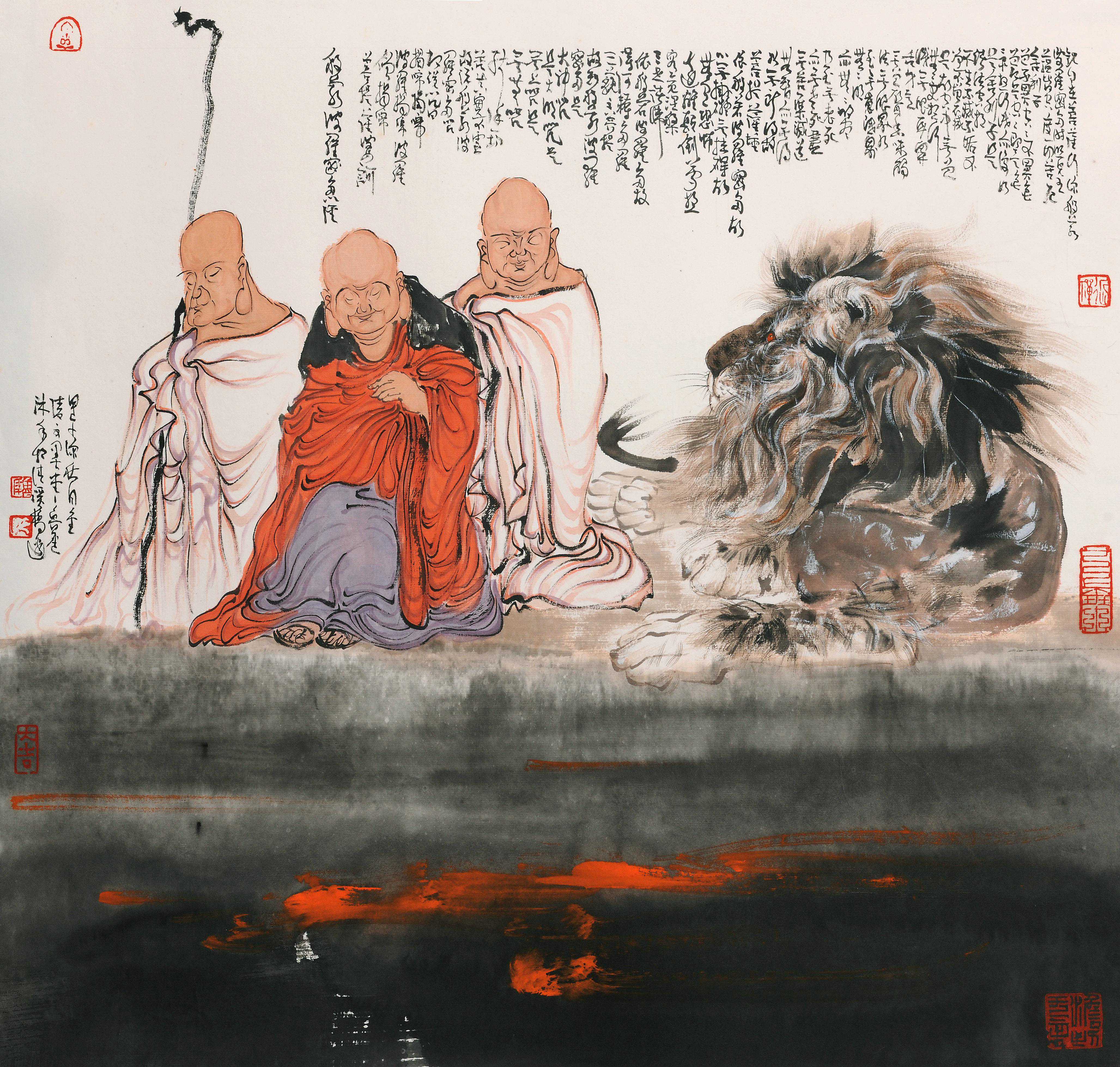 鲁迟笔下的人物具有独到的传神形象,凸显了独特的线条之美,尤其是佛像的衣衫线条轻松、自然、生动,勾勒出肃穆端庄的佛祖,慈悲沉静的观音。他笔下的钟馗更是震撼人心,圆瞪的大眼、倒竖的浓眉、喷发的胡须,出鞘的宝剑,要斩尽天下魑魅魍魉,杀尽人间牛鬼蛇神,凸显傲岸刚直、嫉恶如仇,不可一世的威严。鲁迟笔下的红衣罗汉长眉大耳,神态各异:或籍教悟宗,凸显专心致志的神色;或禅茶一味,显现悠然自得的神态;或闭目养神,凸显内心宏大,胸有成竹的神情;或面呈笑容,凸显悠然淡定,超然世外,常乐于心的神韵等等。人们拜读之后,增长见识,启迪心灵,慰藉灵魂。