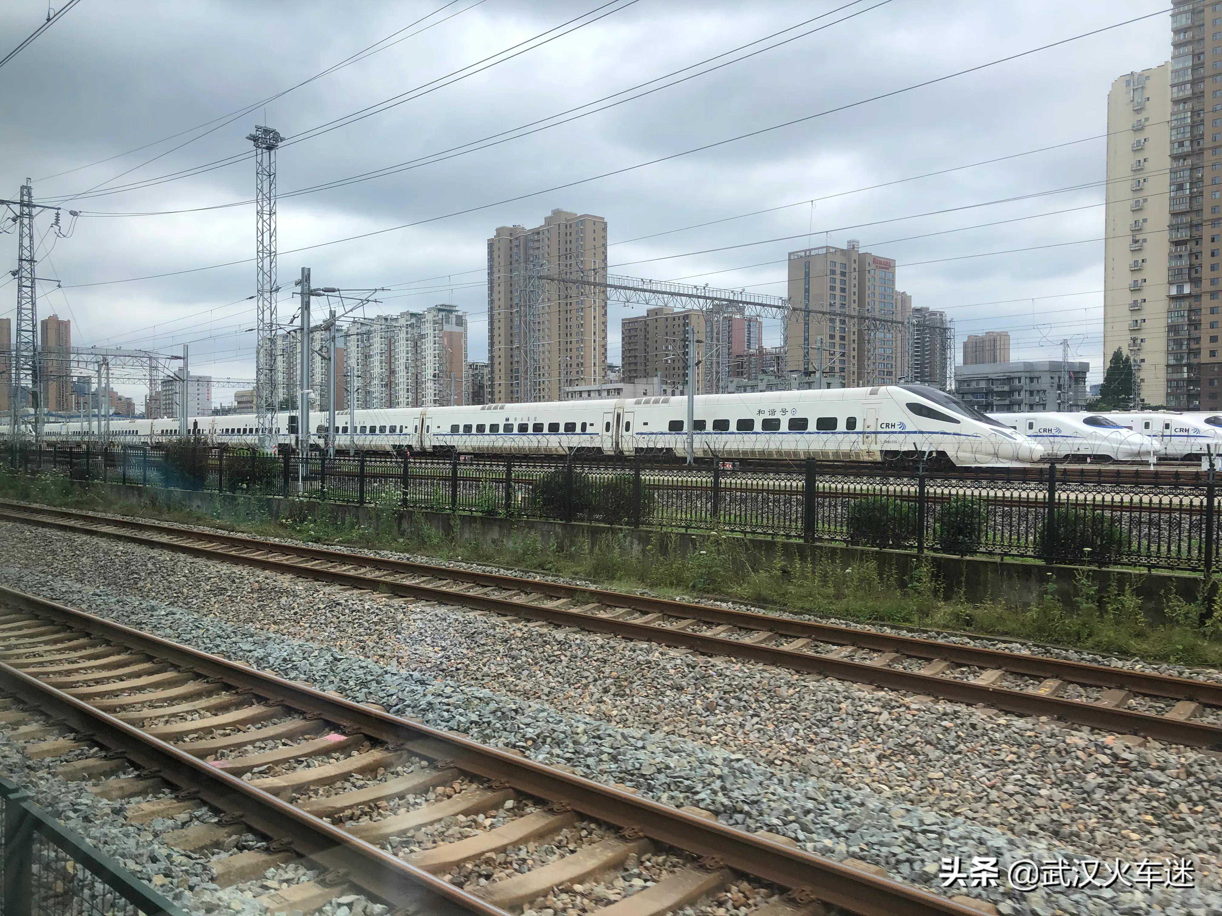 汉口动车所通过,看到停靠有CRH2A、CRH5A等型号的动车组列车,车底均配属武汉铁路局。
