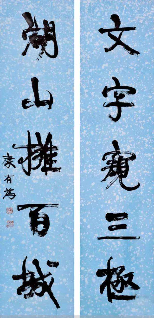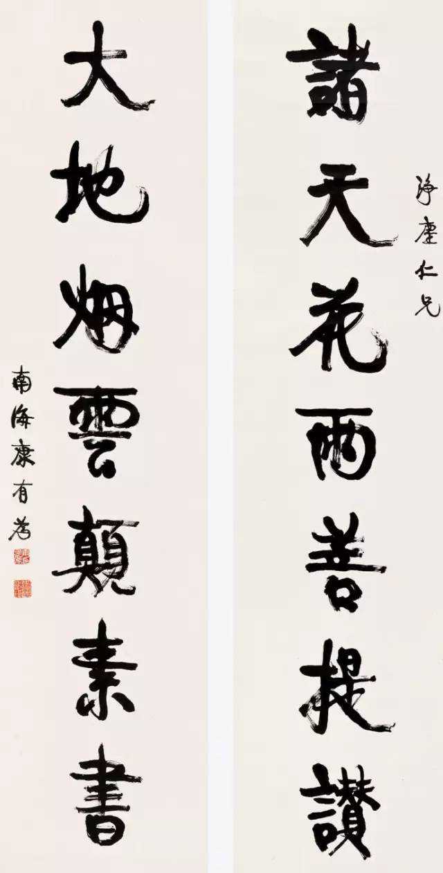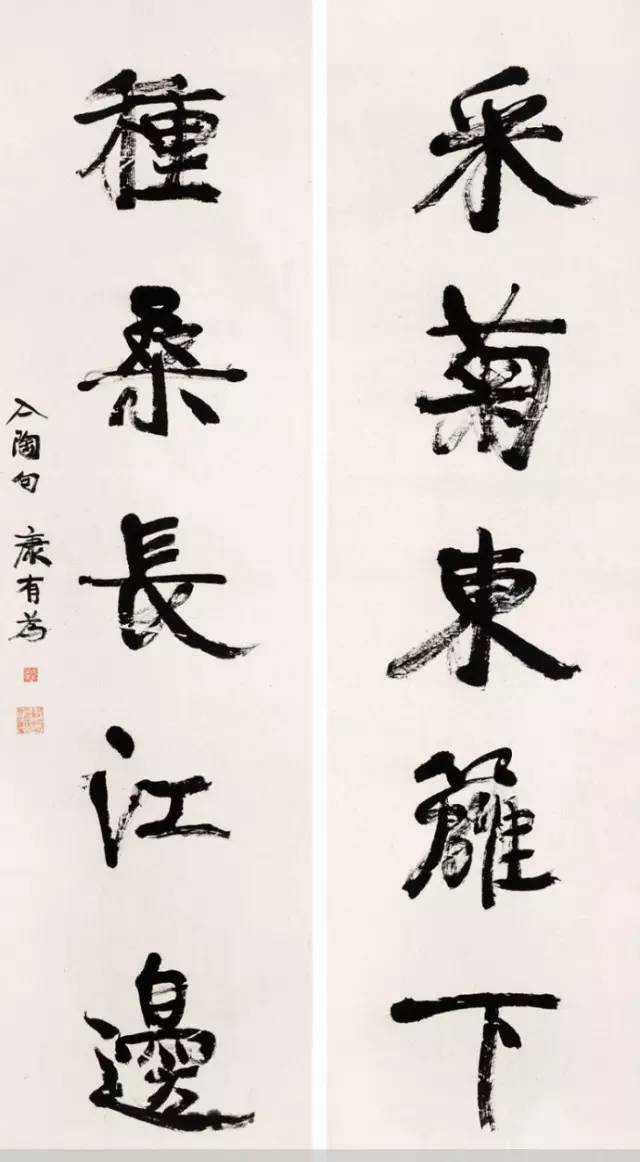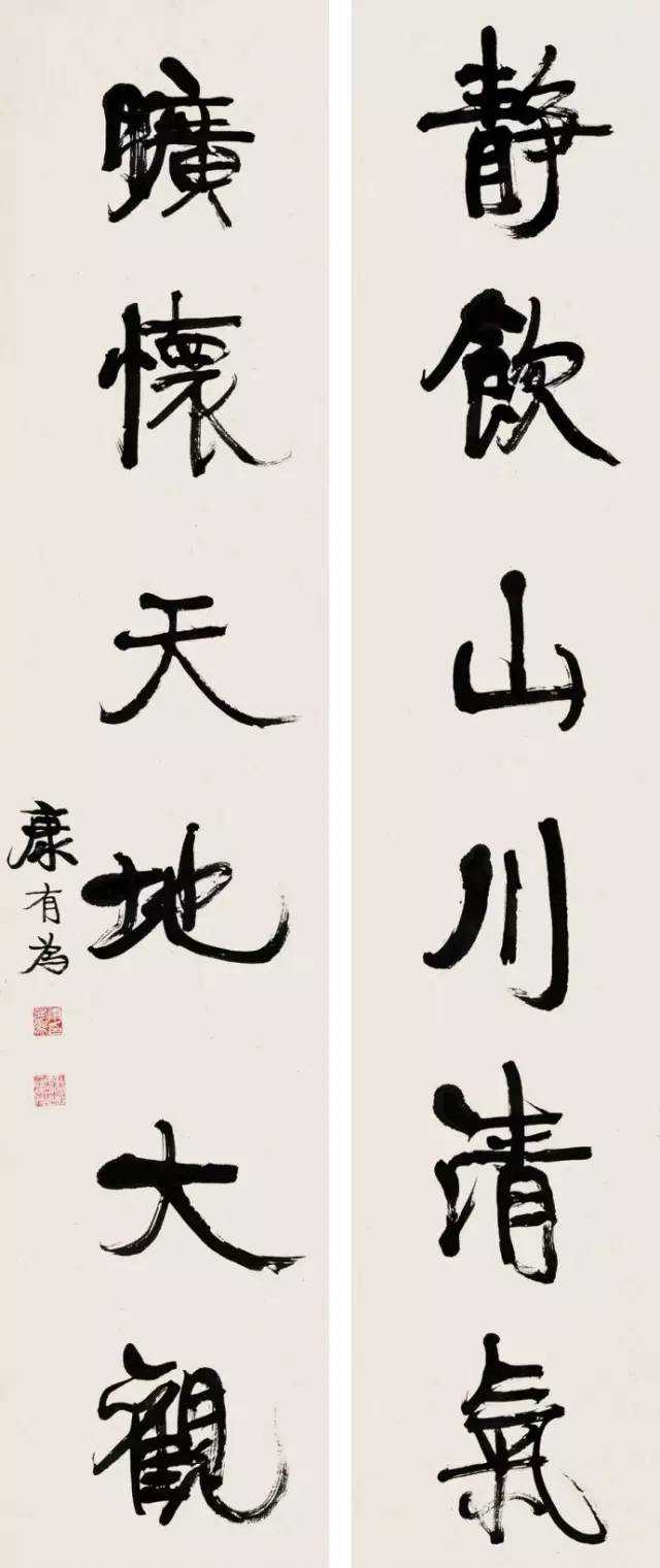 书写时逆笔藏锋,迟送涩进,笔力峻拔。字体笔画平长,横平竖直,长撇大捺,转折处圆浑苍厚。结字上紧下松,纵横奇宕,气势开张,干脆遒劲,具有浓郁的北碑笔意,可谓熔铸古今,自成气象欣赏康有为书法,其变化多姿、不拘一格,让人眼花缭乱。书体在枯润、疏密、显晦、清浊的变动与游移中,又饱含着紧张、膨胀与挣扎。