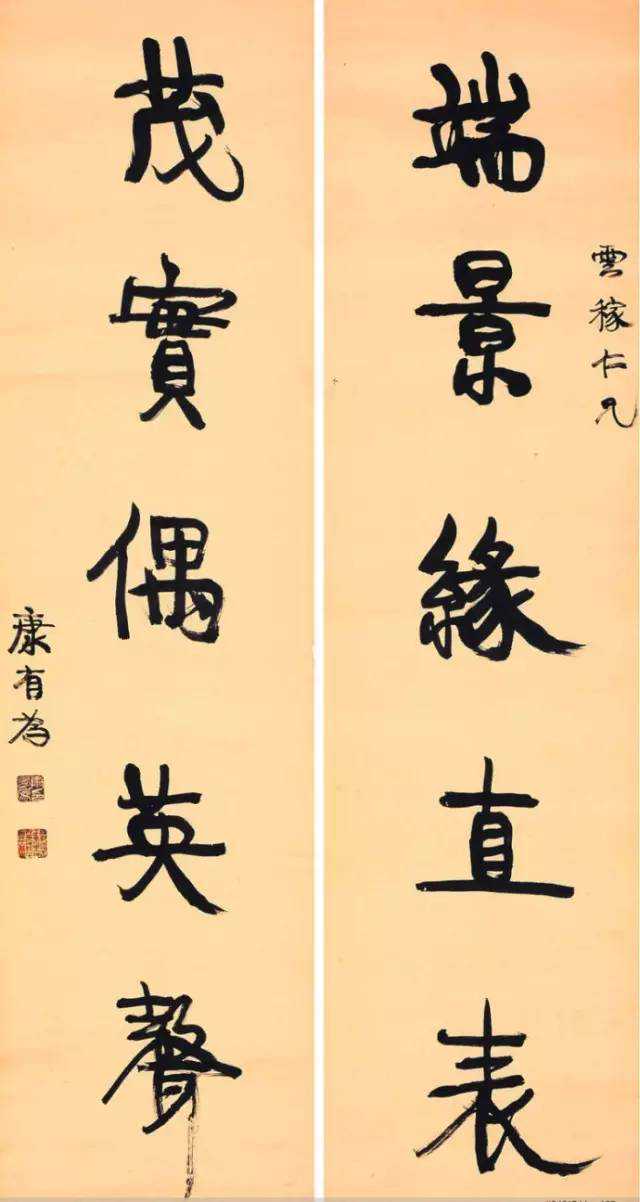 他继阮元、包世臣之后,再度极力标举碑学,将魏碑、北碑推到至高无上的位置。所谓碑刻“十美”,可以概括为:魄力雄强、气象浑穆、笔法跳越、点画峻厚、意志奇逸、精神飞动、天趣酣足、骨气洞达、结构天成、血肉丰满。提出尊魏卑唐主张。倡导北碑运动,对清末书风颇具影响,打破了几千年来帖学一统天下的格局,对二王传统帖学构成了强有力的冲击,形成了近现代书坛碑派书法创作的主流形态。康有为的书法世称“康体”,此八条屏书法得力于《石门铭》与《经石峪》,融篆隶于行楷,墨色苍润相间,具古朴雅致之气。