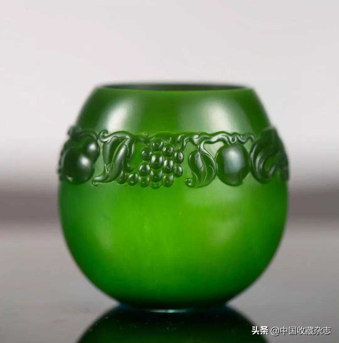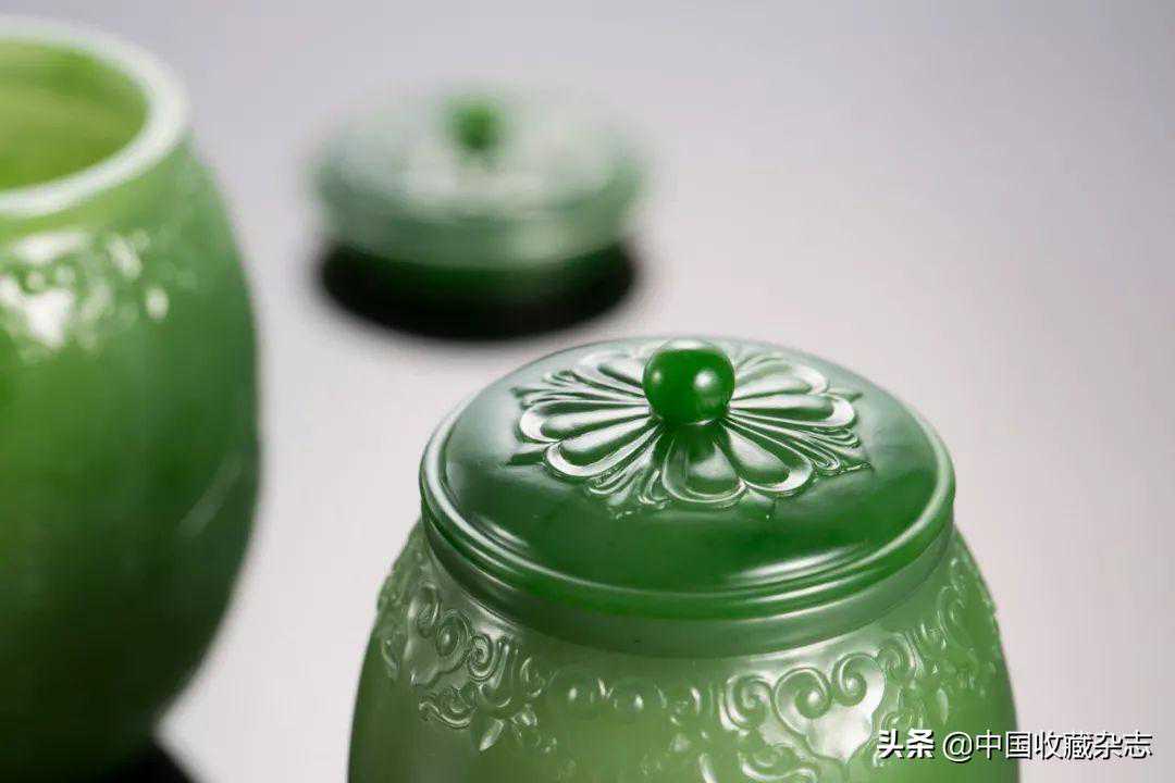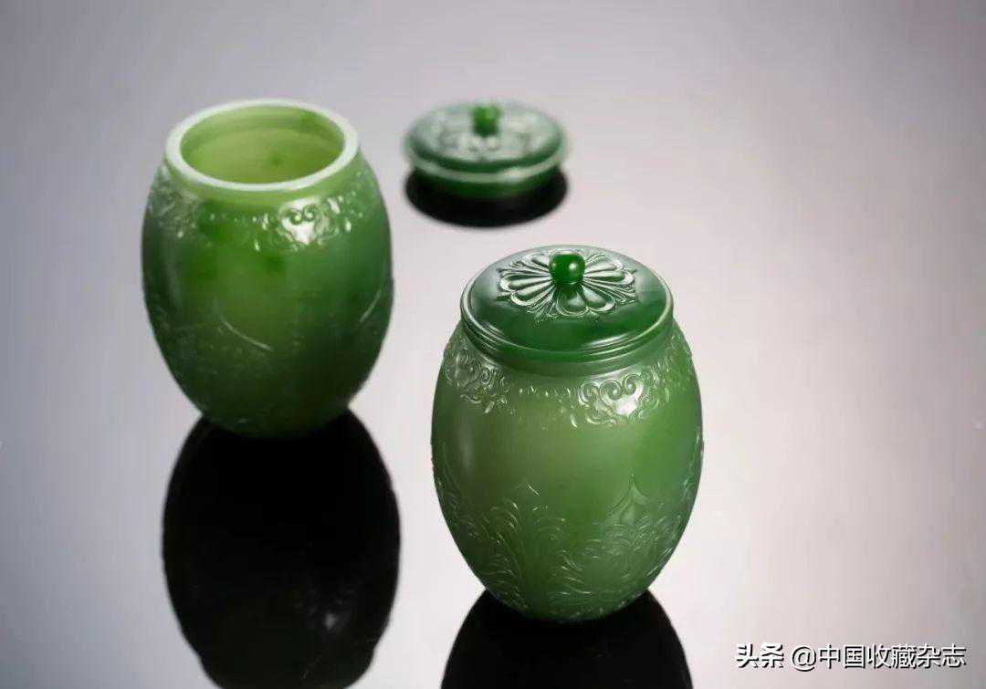 由优质碧玉雕琢而成,材质细腻,色泽明快。造型圆润饱满,厚薄均一,透光通灵生动。罐身及罐盖雕琢宝相花纹,精巧细致。整件作品给人以古朴典雅,清新脱俗之感,是值得收藏的小件器皿佳作。