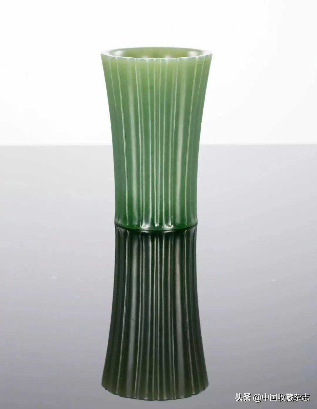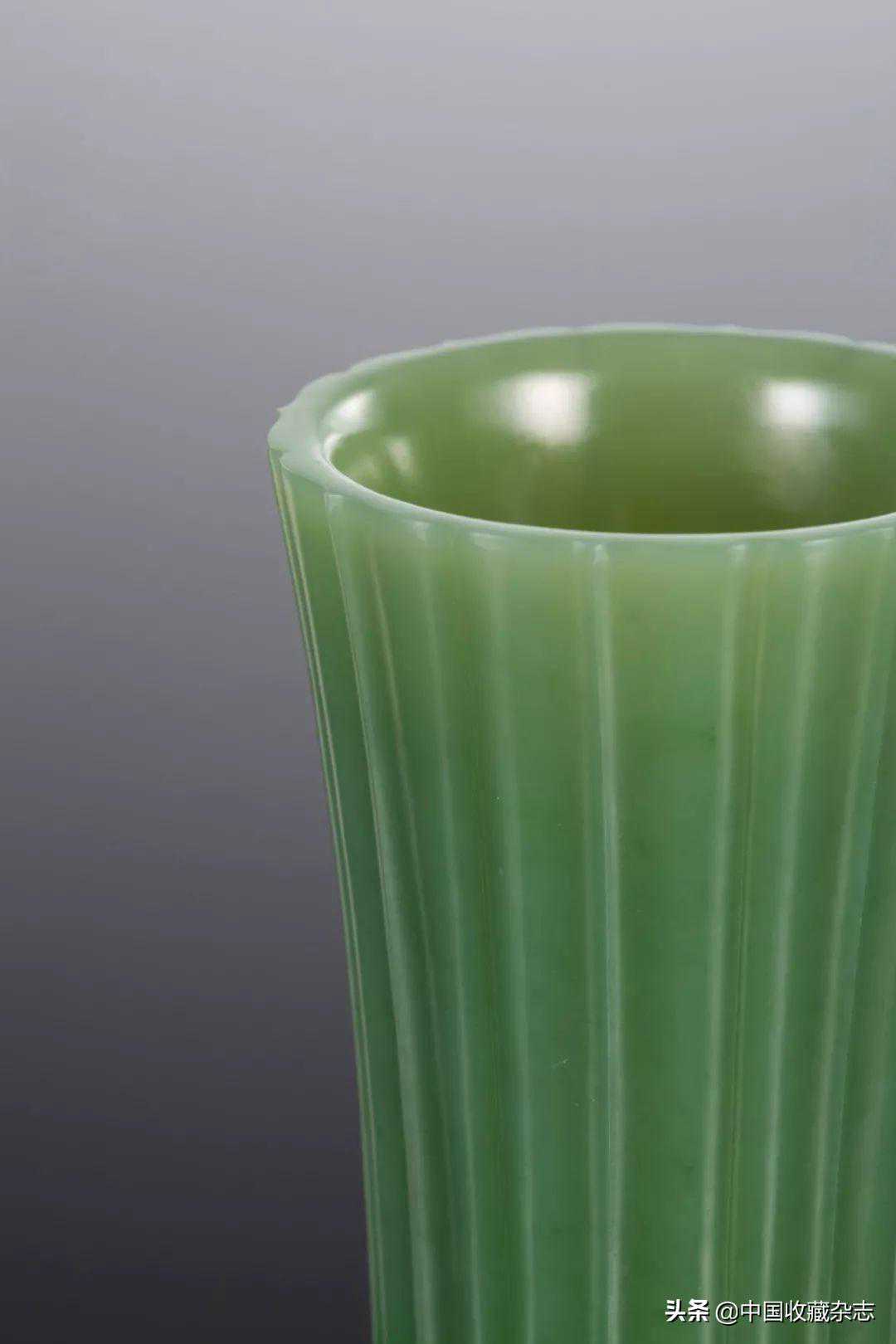 花觚亦称为“尊”,是仿青铜器造型的一种陈设花器。作品采用一整块上等俄罗斯碧玉料掏空雕磨成瓜棱尊模样,玉料温润,颜色淡雅,器型规整,器壁厚度均一,线条自然流畅不失灵动,文气十足,适于收藏。