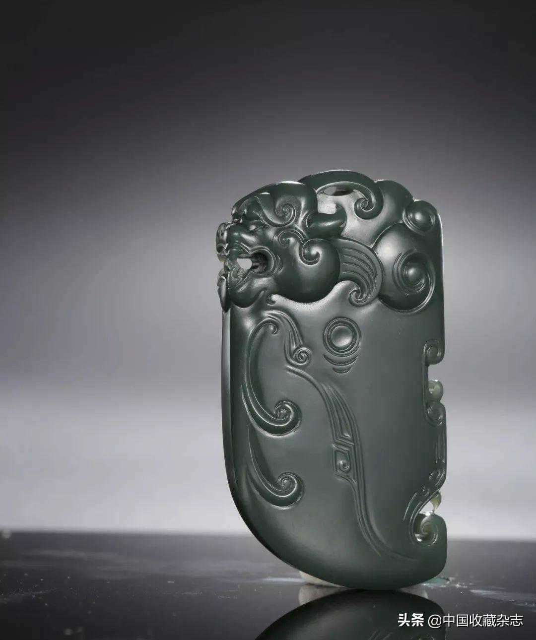 选用优质青玉为原料,玉质温润,颜色深沉,结构细腻。作者运用浮雕技法于玉面刻画出龙首,并点缀中国传统纹饰,风格古朴,气势恢宏,整体刻画精致,疏密结合,繁简有序,适于佩戴。