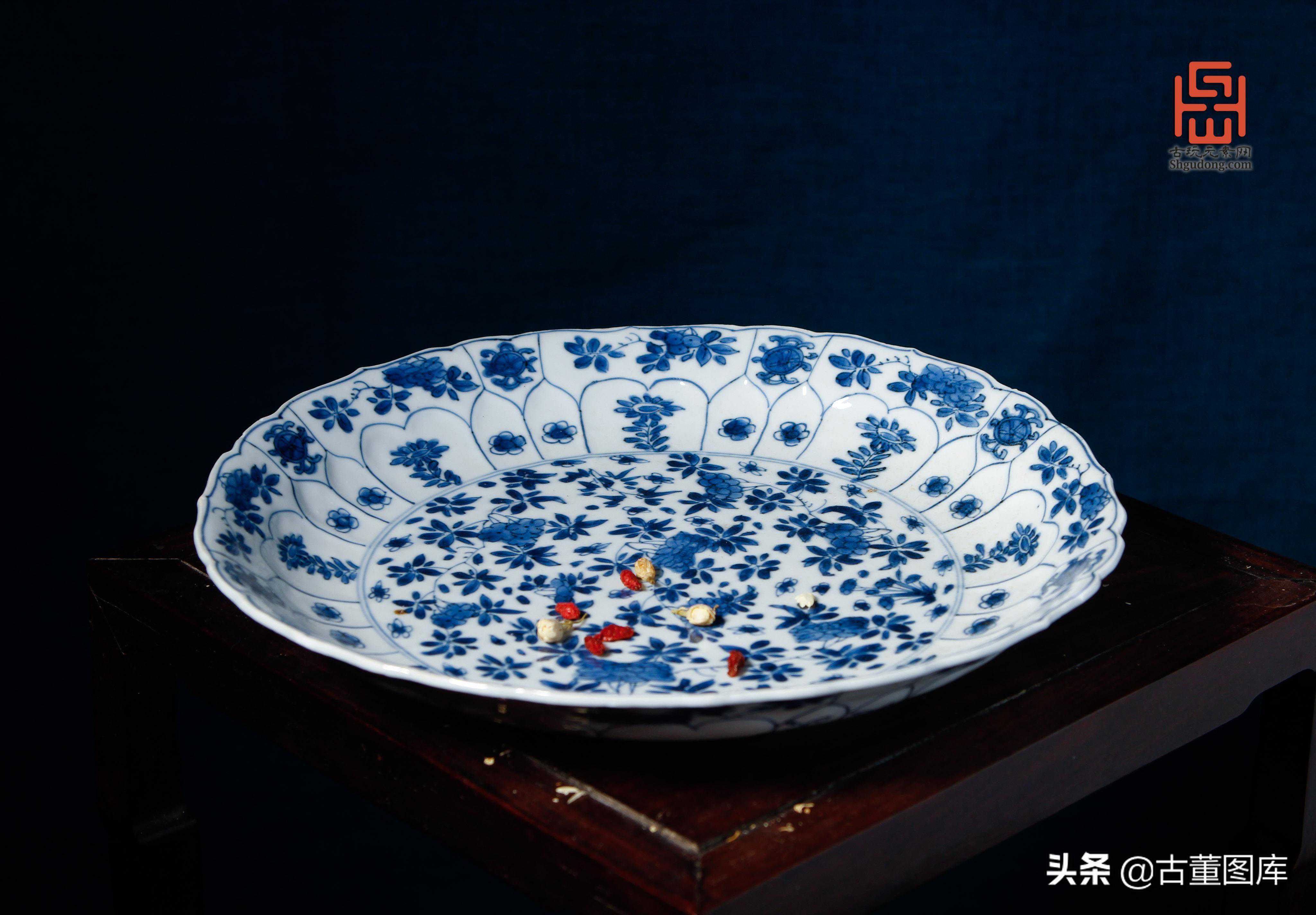 清康熙青花花卉纹莲瓣花口盘清康熙青花花卉纹莲瓣花口盘尺寸:口径25cm、高3.7cm品相:盘内少许窑灰、口虫咬藏品说明:此盘花口菱边,折沿浅弧腹,圈足。盘壁模印莲瓣状。口沿上青花杂宝花卉为饰,内壁青花折枝花卉纹,外壁同样以青花花卉纹为饰,盘中间满布青花花卉纹。纹饰繁密,但安排有致并不杂乱,具体表现为...
