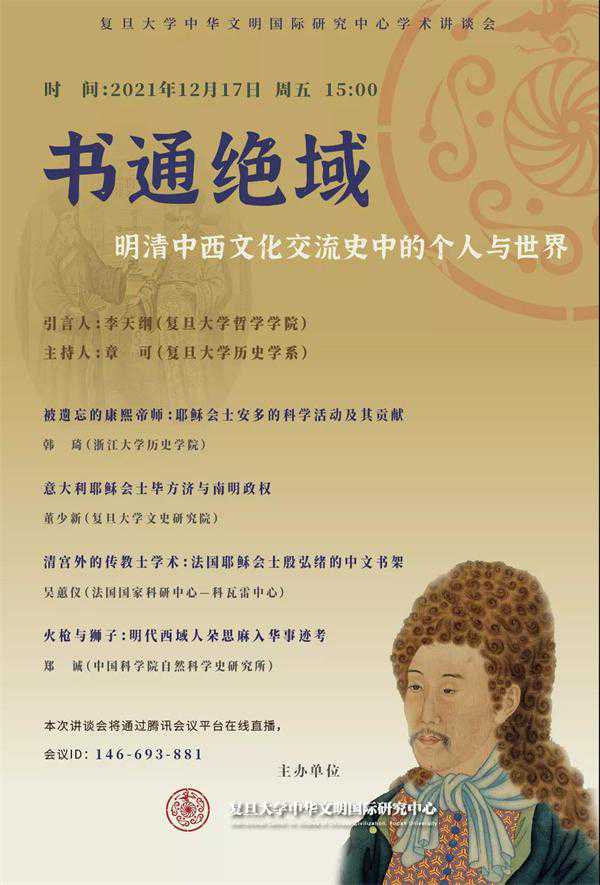 天地无用/整理书通绝域:明清中西文化交流史中的个人与世界时间:12月17日(周五)15:00地点:腾讯会议(ID:146693881)嘉宾:李天纲(复旦大学哲学学院宗教学系教授)、章可(复旦大学历史学系副教授)、韩琦(浙江大学历史学系教授)等本次中西文化交流史论坛,几位报告人将分别就耶稣会士安多的科...