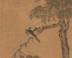 《梧桐白头图》轴,清,阙岚,绢本设色,纵101厘米,横40.5厘米。《梧桐白头图》是画家75岁时绘制的,工写结合,笔墨清灵,有一种纤尘不染的秀洁韵味。上部绘挺健梧桐,叶茂子实,一枝斜穿画面,绿叶飘动。一对白头鸟依偎枝上,亲密无间。下部绘神奇多彩灵石,石缝坡脚间花草杂生。笔墨细腻古朴,风格温润典雅。左...