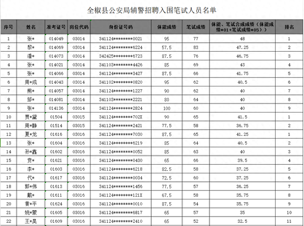 滁州市公安机关2024年度公开招聘警务辅助人员笔试结果暨入围面试名单公示现将滁州市公安机关警务辅助人员公开招聘笔试结果暨入围面试人员公示如下:一、笔试成绩和面试情况根据体能测评结果、笔试成绩,符合条件进入面试环节的考生共491人。二、领取面试通知书时间入围面试的考生请于2024年4月11日(星期四上...