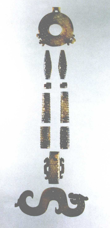 春秋战国玉佩饰中最突出的是成组玉佩。成组佩玉,最晚在西周晚期已出现,春秋继之。这类玉佩,按古籍所载,是按一定格式组串的,完备的组串玉饰有上、中、下三组。最上一组为玉珩一件,形作不规则的璜形;中间一组的中央为一件玉环或玉瑗,左右两侧有呈对称状的璜各一件;最下层的左右各有一件玉冲牙,中央一件扁平式样小玉...