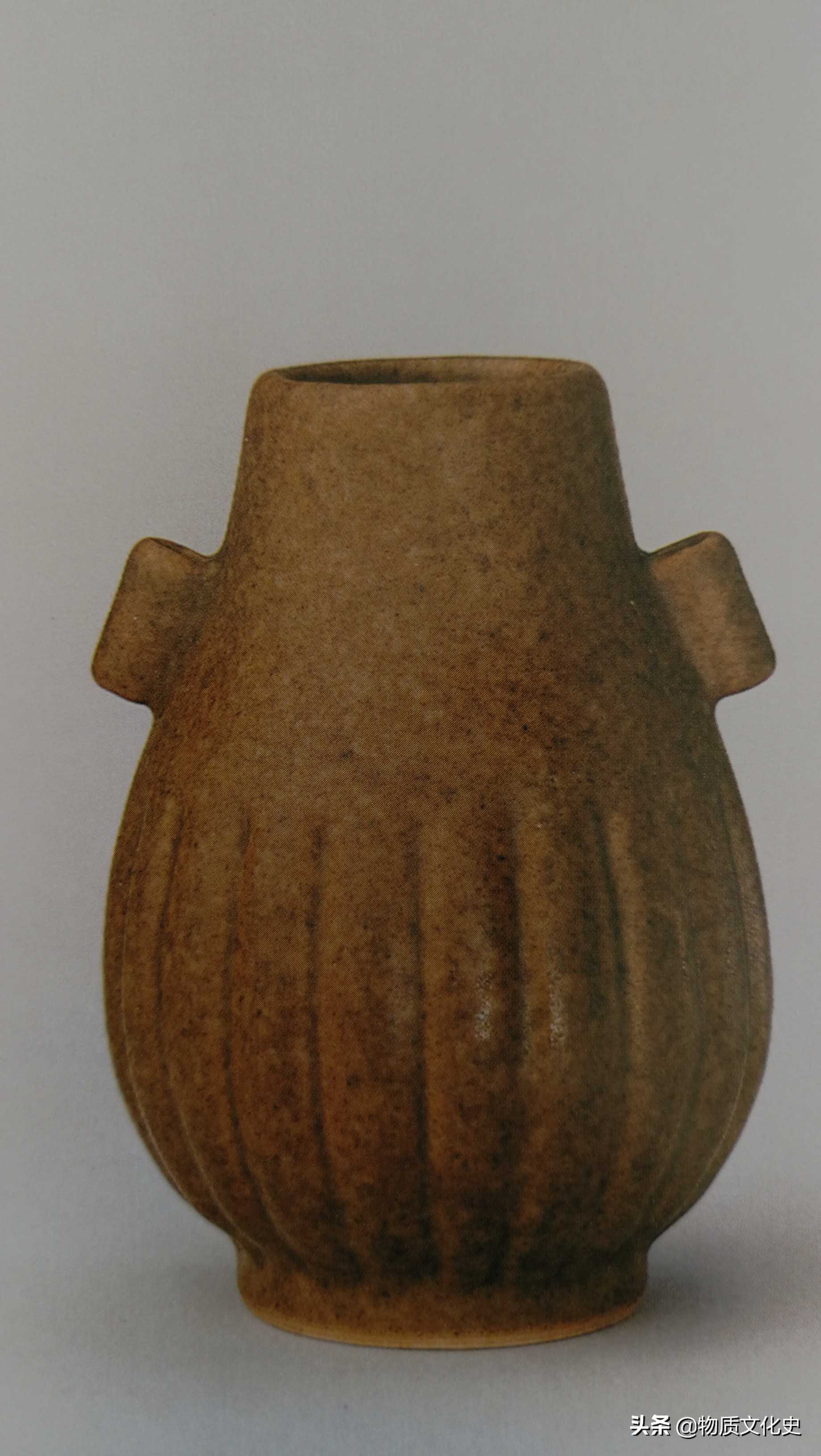 厂官釉贯耳瓶,清雍正时期所制,高9.2厘米,口径3.1厘米,足径3.9厘米。清宫旧藏。厂官釉是中国古代铁结晶釉中的重要品种,其名称始见于清代,其色有鳝鱼黄、油绿、紫金等色,直隶厂窑所烧,故名“厂官”。多缸、钵之类,釉泽苍古,配合诸窑另成一家。(接上图)瓶直口,短颈,溜肩,腹呈瓜棱形,圈足。肩部有两贯...