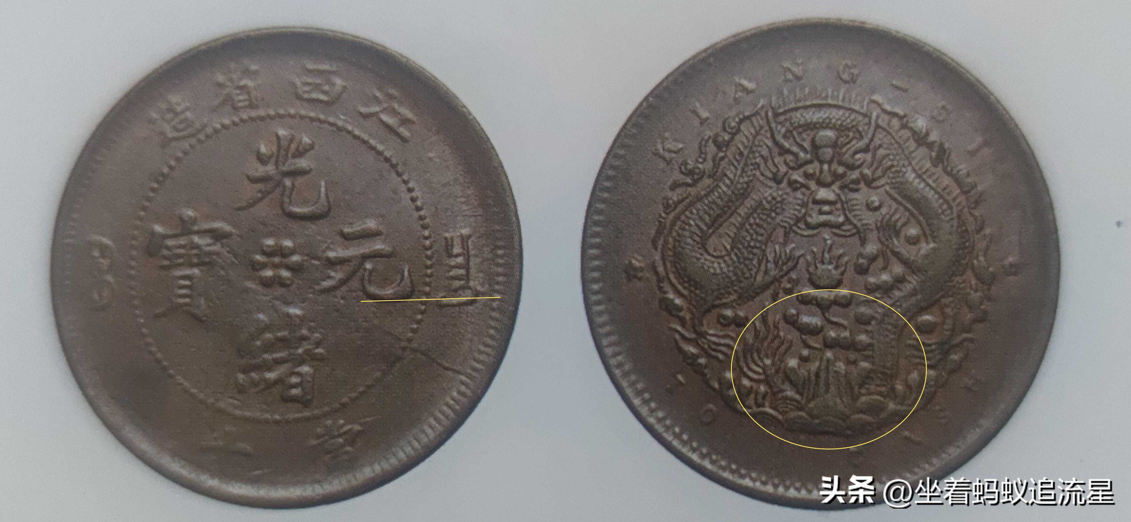 平脚昌低元:满文昌接近∟,且勾昌低于元字(看图一)平脚昌低元单星曲云/10级(正面为:上缘铸“江西省造”,下缘铸“当十”,左右铸“满文宝昌”,中间铸“光绪元宝”四字。背面龙图为坐龙,与其他坐龙不同的是,此版龙足右侧有一朵曲云)平脚昌低元反尾龙/8级(正面为:上缘铸“江西省造”,下缘铸“当十”,左右铸...