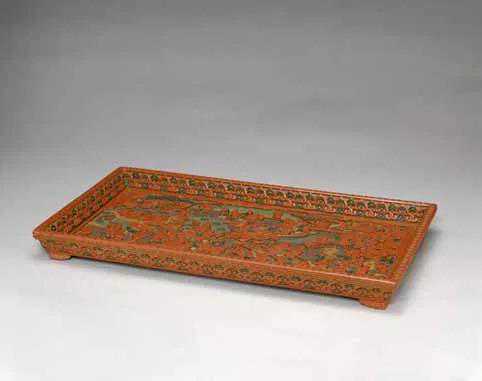剔彩百子睟盘,高5.6cm,长58.7cm,宽32.7cm。盘长方形。色漆自下而上为草绿、紫、黄、绿、红五层。盘中雕婴戏图一幅,场面热闹非凡,人物形态各臻其妙。色漆典雅富丽,鲜洁明快,层次分明,且变化丰富。盘底髹黑漆,镌“大清乾隆年製”和“百子睟盤”楷书铭。百子是指画面中数十幼儿,“睟”通“晬”,即...