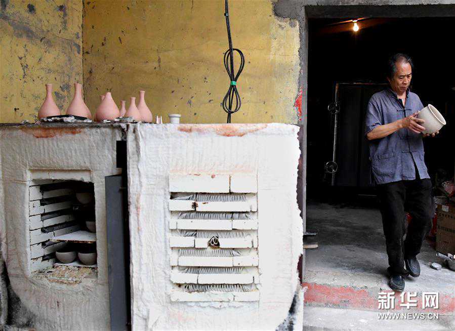 在河南省巩义市站街镇小黄冶村的工作室里,游光明在施釉(6月19日摄)。新华社记者李安摄题:千年窑火:生生不“熄”,炼铸永恒之美河南,巩义,小黄冶村。从门口、路边到窗台、桌面,到处堆满瓶瓶罐罐,连花盆都是自己烧制的废品。在中国陶瓷史上知名窑口——巩县窑的黄冶窑窑址附近,63岁的游光明把简陋的农家院当工...