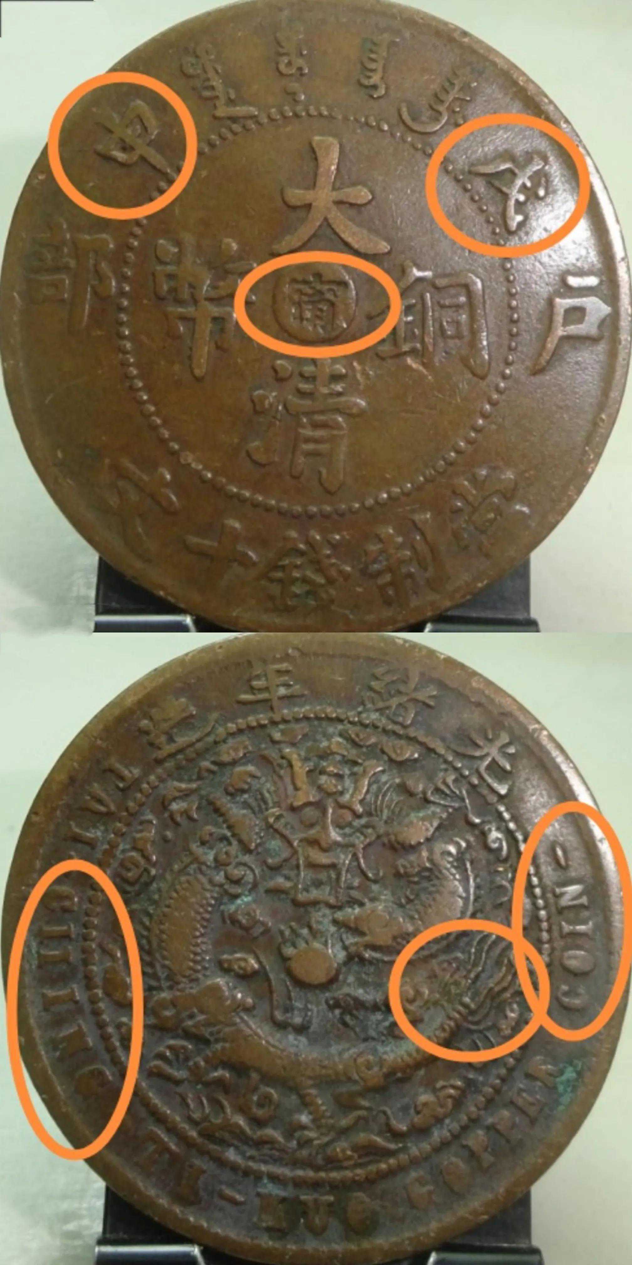 光绪三十四年(公元1908年),岁在戊申。江南铜元局制造戊申纪年大清铜币,字面只有一个大版,极其细微区别,暂不作为版别区分。龙面可分为五火焰大眼龙、低冠短六尾和低冠长六尾以及高冠错英文。其中大眼龙五火焰属于错配是戊申宁中最少的一款,其次为高冠弯角龙四处错英文两个版。低冠龙长、短六尾龙和高冠弯角龙四处...